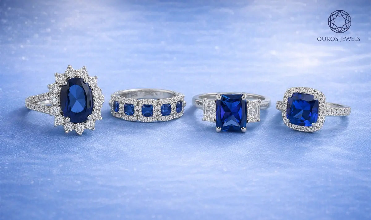 Unique engagement rings featuring a blue lab grown sapphire center stones from Ouros Jewels