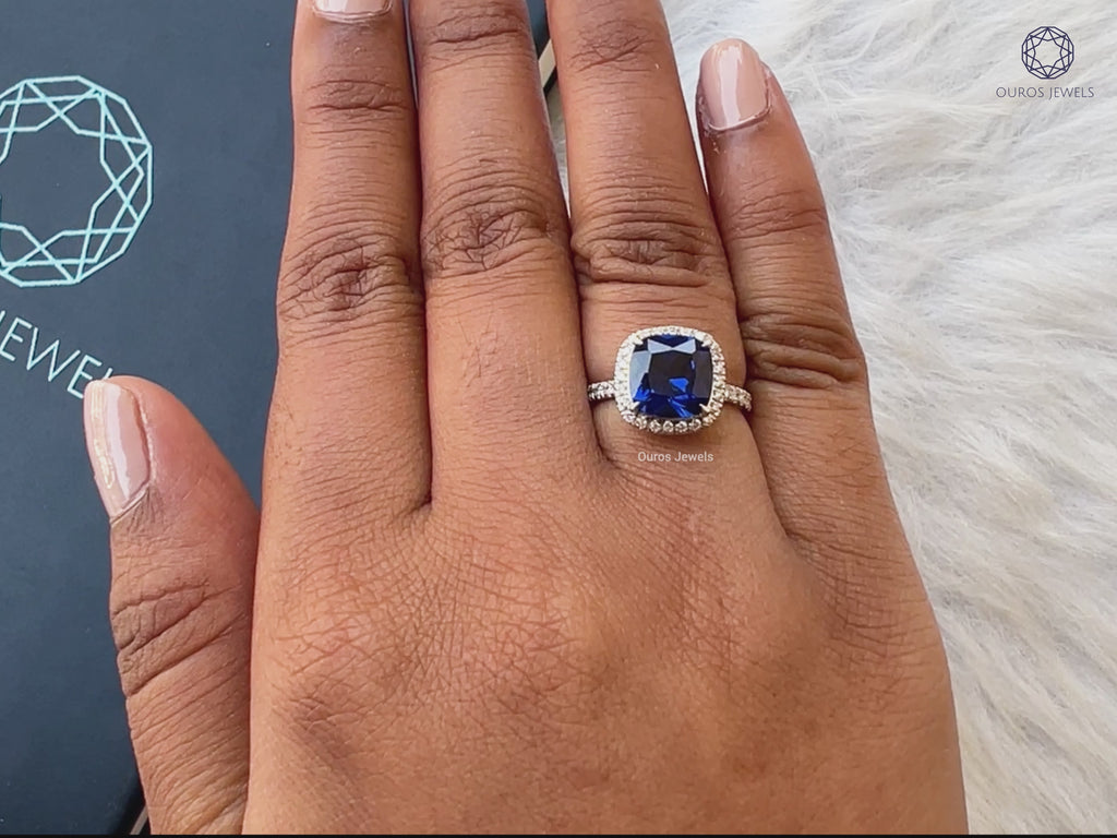 Blue Cushion Cut Halo Diamond Engagement Ring