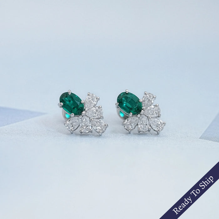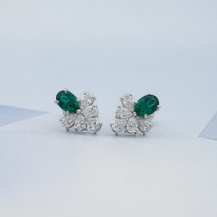 Green Oval And Pear Lab Diamond Floral Stud Earrings