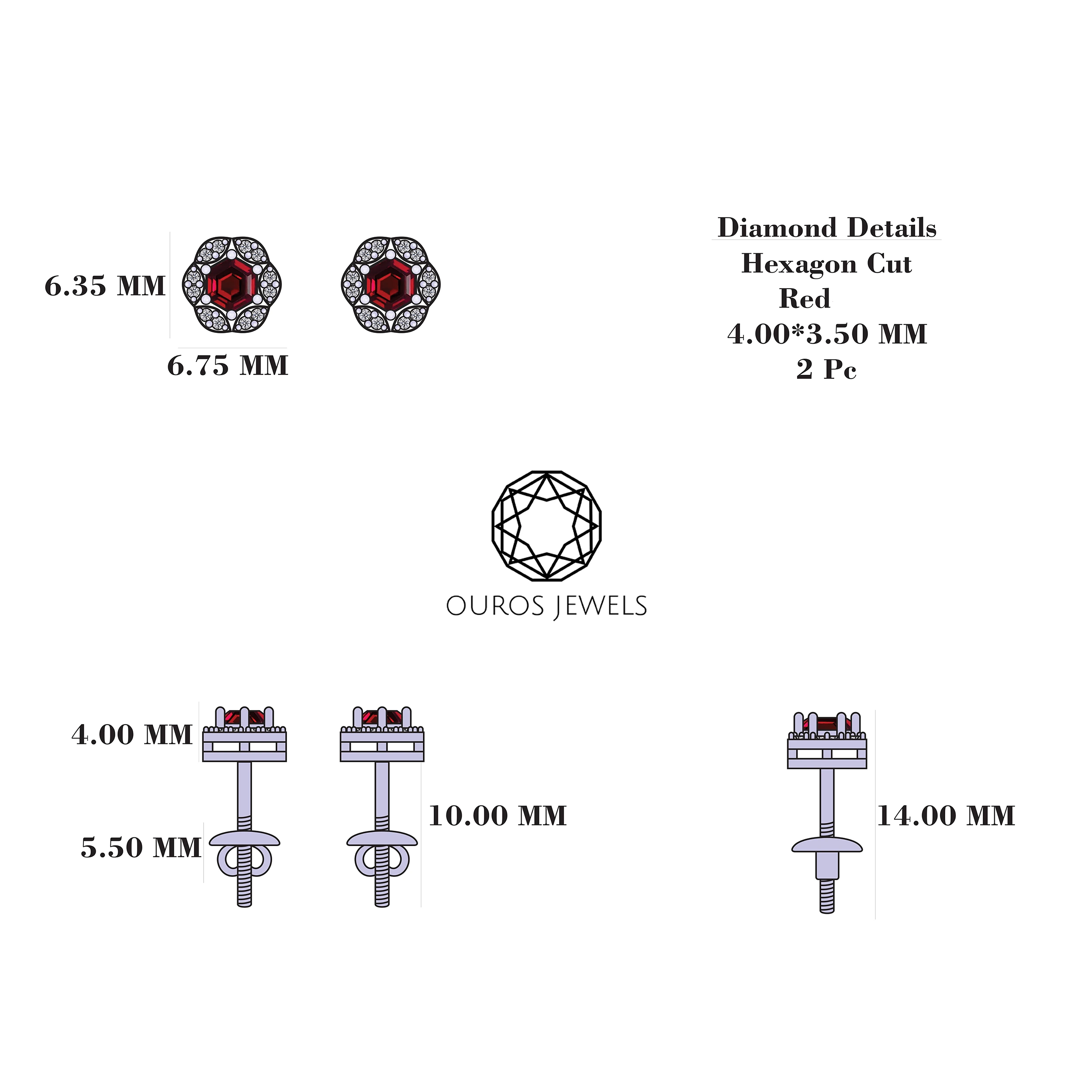 Hexagon Cut Red Ruby Gemstone Halo Stud Earrings